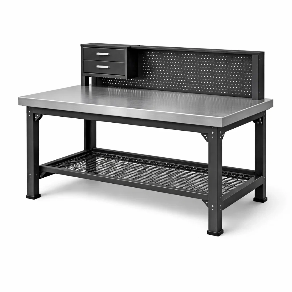Caratteristiche: Due cassetti, pannello forato per attrezzi, ripiano inferiore in rete metallica