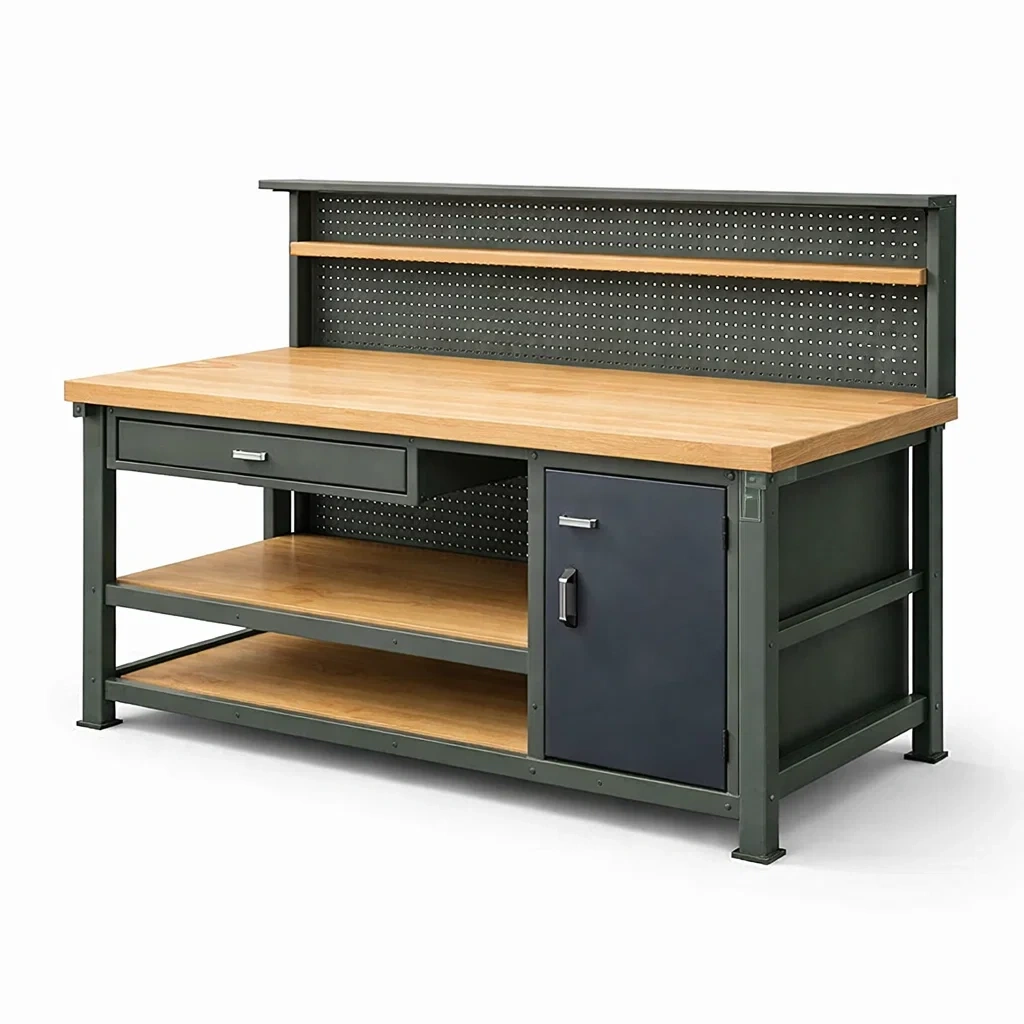 Banco da lavoro in acciaio e legno con cassetto e armadio