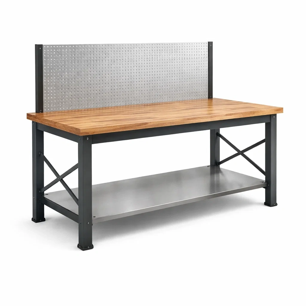 Materiale: Piano in legno di faggio, struttura in acciaio verniciato, pannello forato in acciaio zincato.