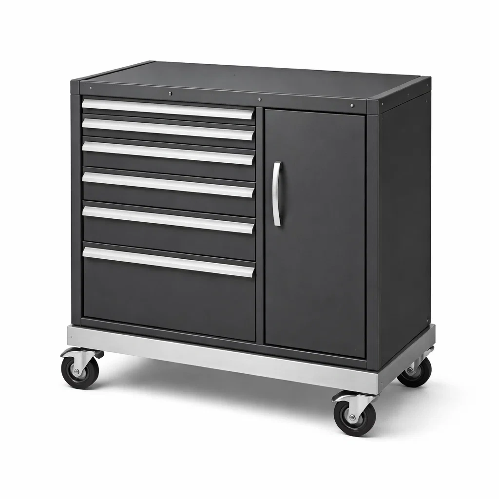 Carrello portautensili in acciaio con sei cassetti e ripiano nero