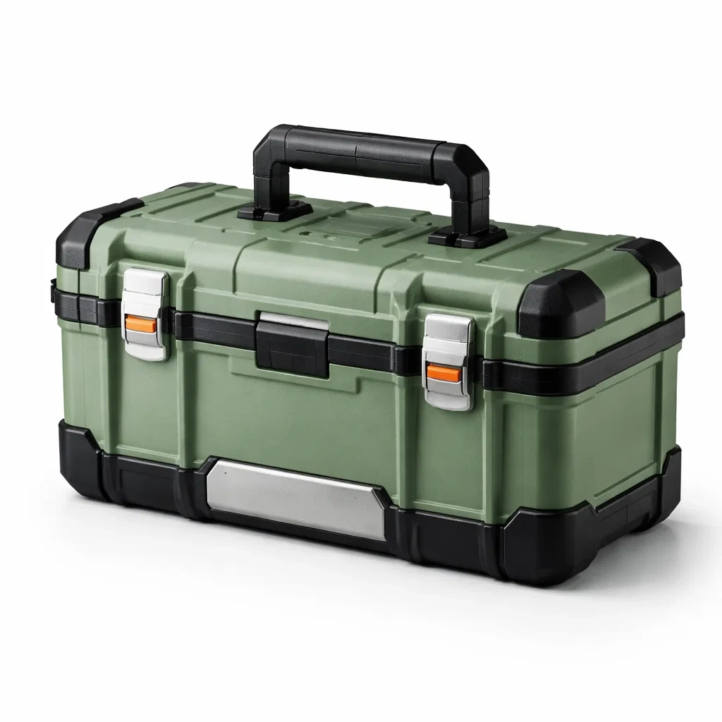 Cassetta degli attrezzi in plastica verde con chiusura in metallo