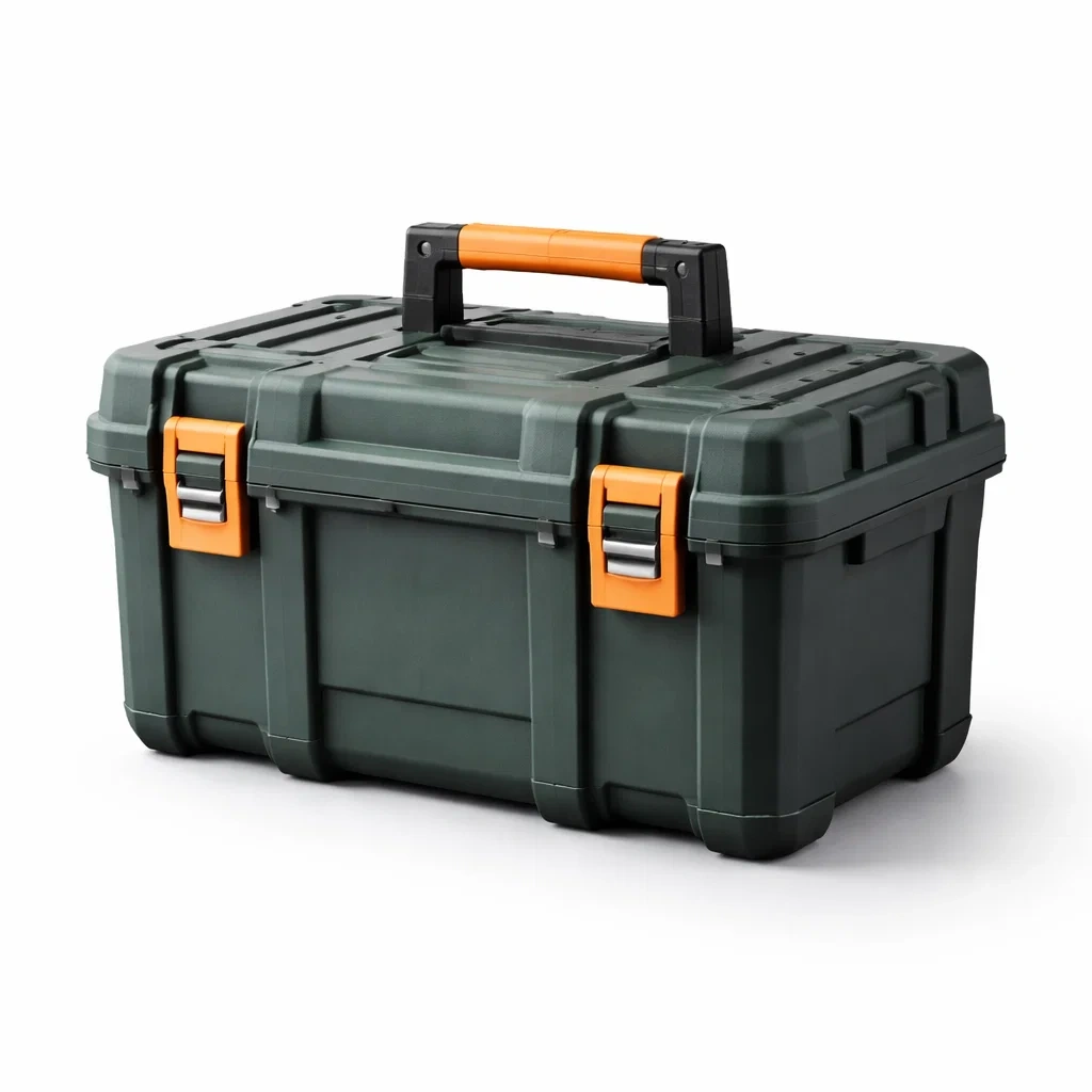 Cassetta degli attrezzi in plastica verde scuro con dettagli arancioni