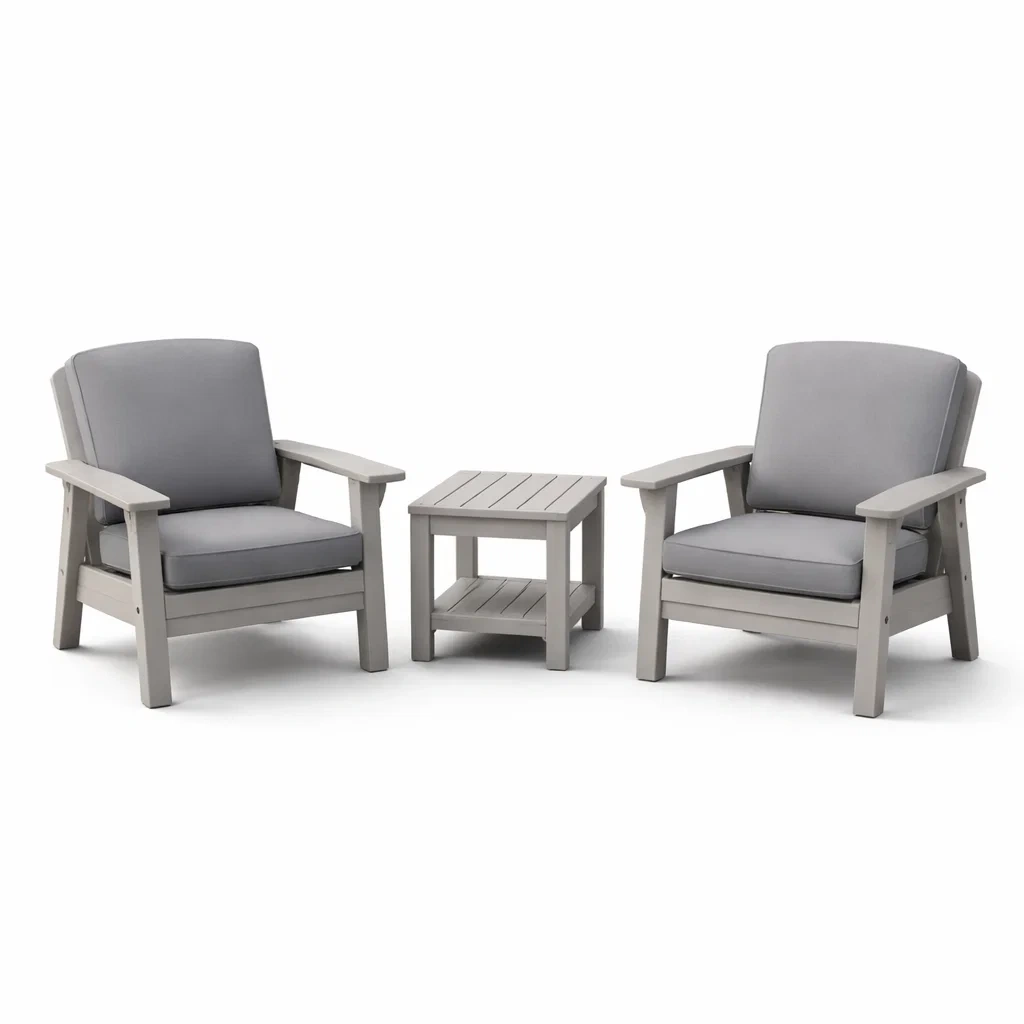 Set da relax piccolo in legno composito con sedie e tavolino e cuscini grigi
