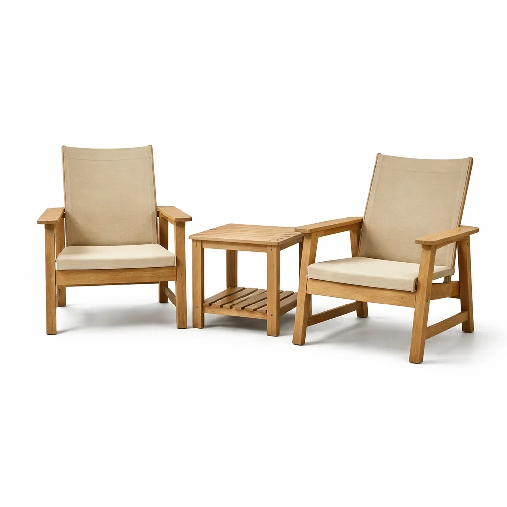 Set da relax piccolo in legno con sedie e tavolino e rivestimento beige