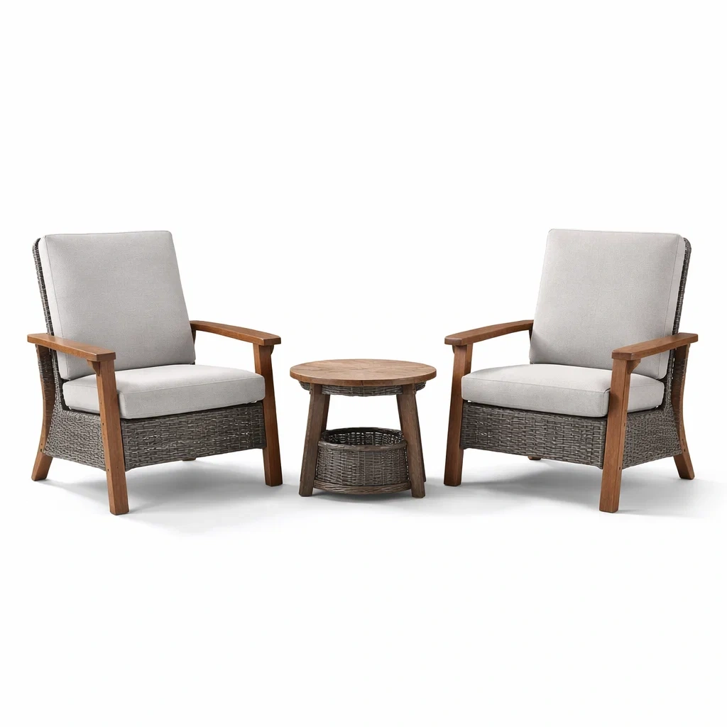 Questo set include due poltrone e un tavolino. Le poltrone sono realizzate con una struttura in legno di teak e rattan sintetico, con cuscini imbottiti in schiuma e rivestiti con tessuto in poliestere di colore grigio. Il tavolino ha un piano in legno di teak con finitura marrone e un ripiano inferiore in rattan sintetico.