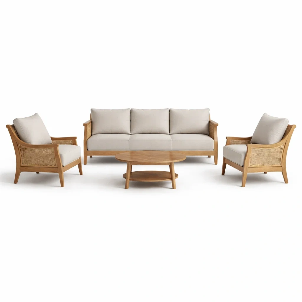 Materiali: Struttura in legno di teak, rattan intrecciato, cuscini con rivestimento in tessuto di poliestere, imbottitura in schiuma poliuretanica.